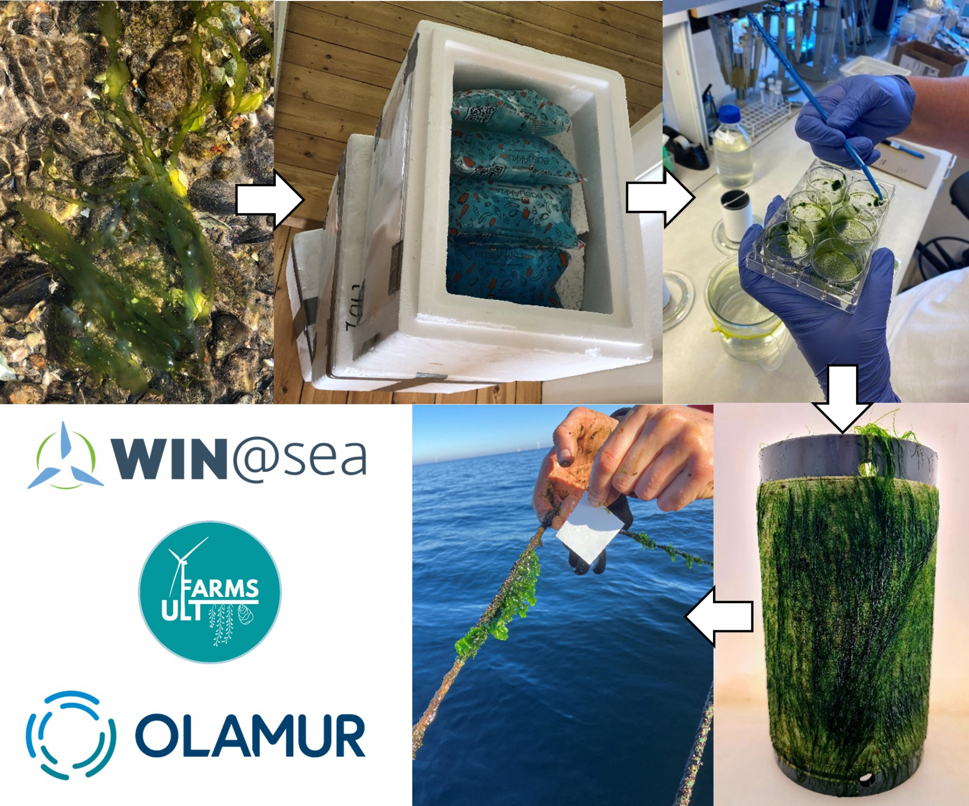 Auf der Suche nach einem für die Aquakultur geeigneten Makroalgenstamm, der in der komplexen Umwelt der westlichen Ostsee gedeiht, wurden in zwei aufeinander folgenden Jahren an sieben verschiedenen Standorten in der Ostsee Proben der grünen Makroalge Ulva entnommen (DNV, FuE-Zentrum FH Kiel GmbH). Im Labor wurden die Proben mit den besten Stämmen unter Leitung der Universität Göteborg ausgewählt und aufgezogen. Schließlich wurde der beste Ulva-Stamm unter den Proben an die Partner von OLAMUR/WIN@sea (Universität Aarhus, Kerteminde Seafarm, Vattenfall) übergeben, die die Algen erfolgreich im dänischen Kriegers Flak Offshore-Windpark installiert haben.