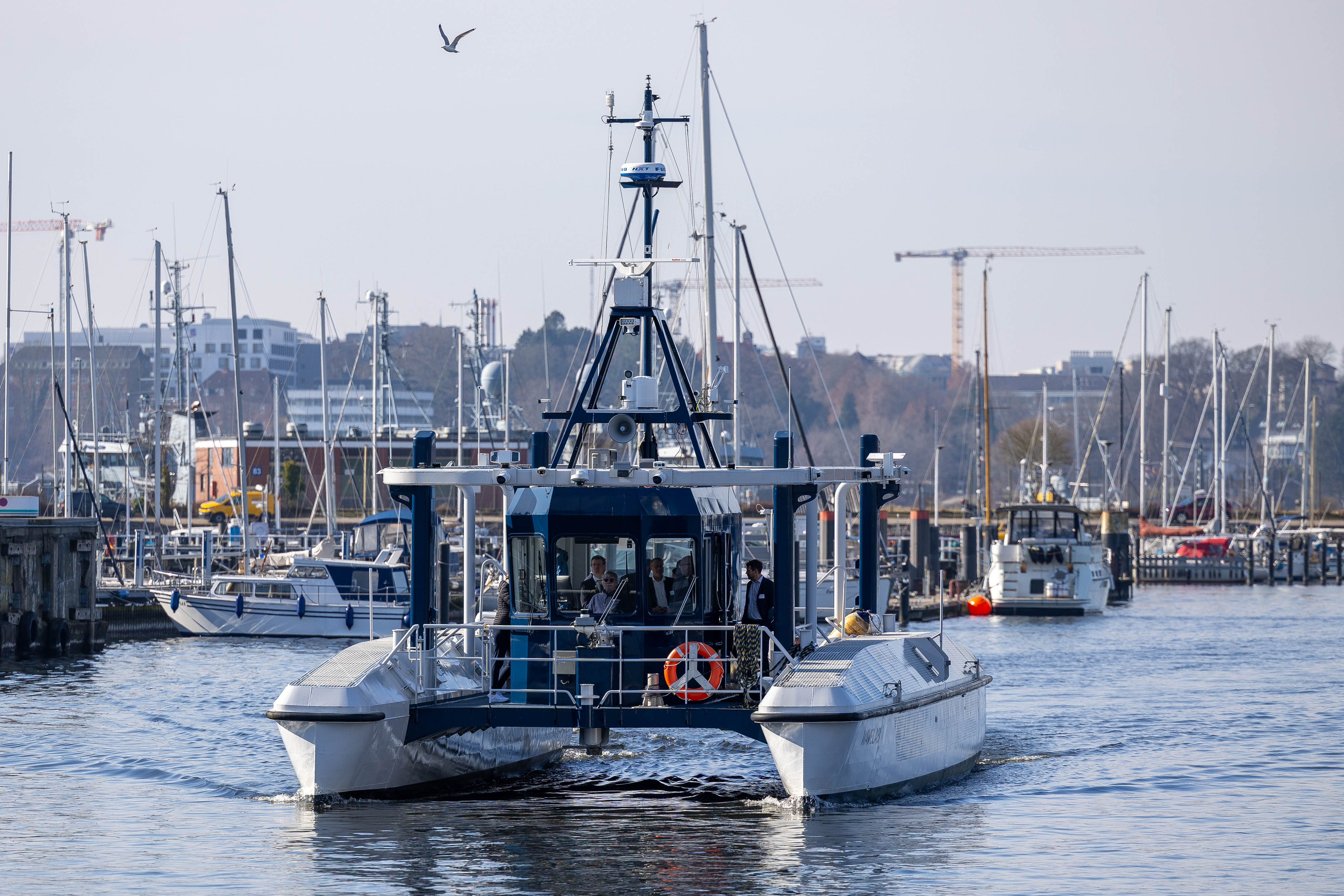 Im Rahmen dieser Veranstaltung nutzte Flottillenadmiral Bock, die Möglichkeit, um mehr Einblicke in die Kieler Forschungslandschaft zu gewinnen. Erstes Hightlight: Die Überfahrt auf der MS Wavelab über die Kieler Förde. Das Forschungsschiff bietet Wissenschaftler_innen die Möglichkeit, autonome Navigation und moderne Antriebssysteme zu erproben. Die F&E GmbH verwaltet die MS Wavelab. Dementsprechend mit dabei: Geschäftsführer Tim Kraemer. Neben der Wavelab präsentierte er Bock die Forschungsinfrastrukturen des Unternehmens.