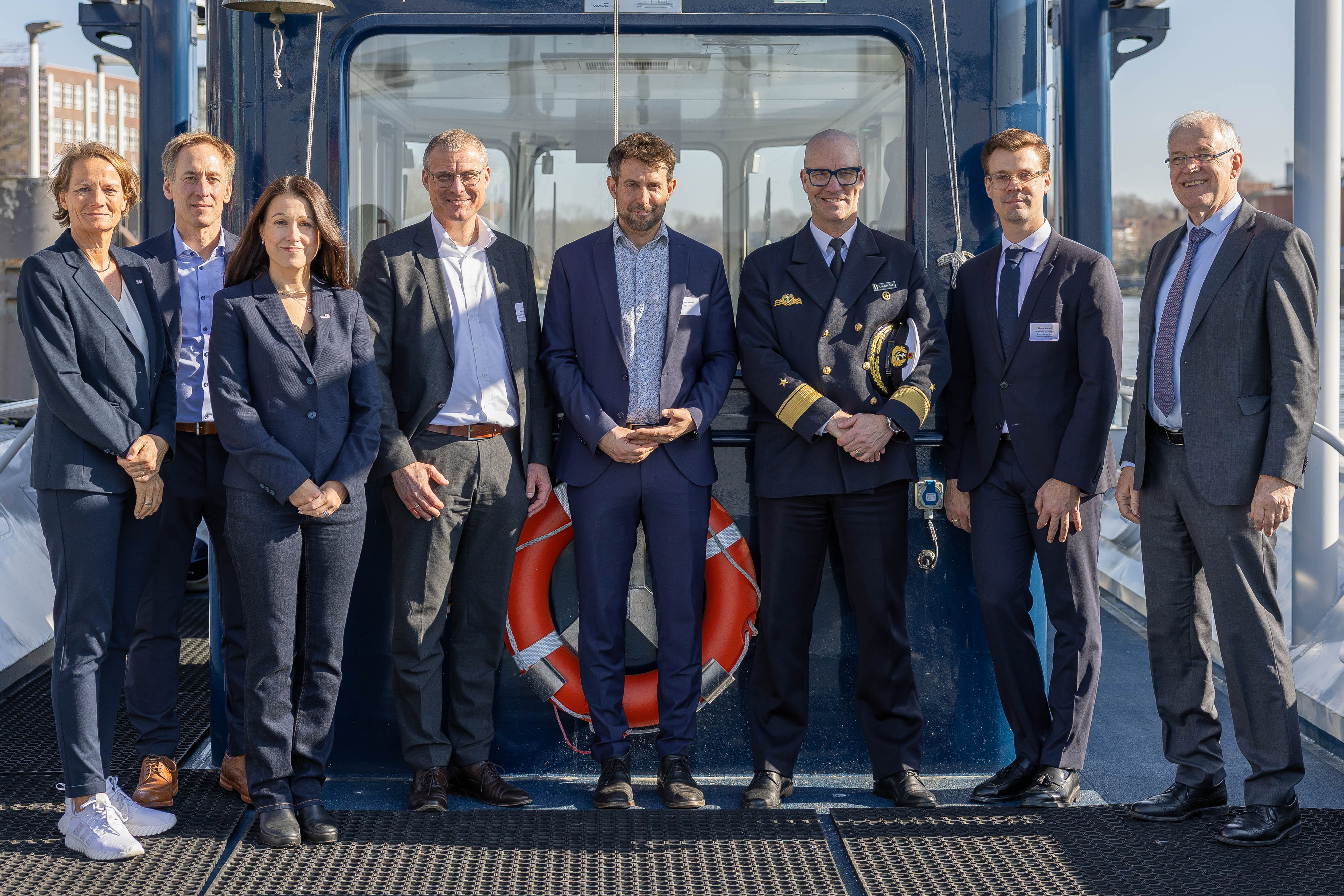Mit dabei auf der MS Wavelab (vlnr): Dr. Wiebke Müller-Lupp (Geschäftsführerin Wissenschaftszentrum Kiel), Axel Koch (Strategie, Forschung und integrierter Transfer CAU Kiel), Kathrin Krüger-Borgwardt (Leiterin Forschungsförderung und Transfer GEOMAR), Prof. Dr. Björn Christensen (Präsident HAW Kiel), Tim Kraemer (Geschäftsführer F&E GmbH), Christian Bock (Flottillenadmiral), Simon Haberl (Deutsches Zentrum für Luft-und Raumfahrt e.V.) und Prof. Dr.-Ing. Eckhard Quandt (Vizepräsident CAU Kiel)